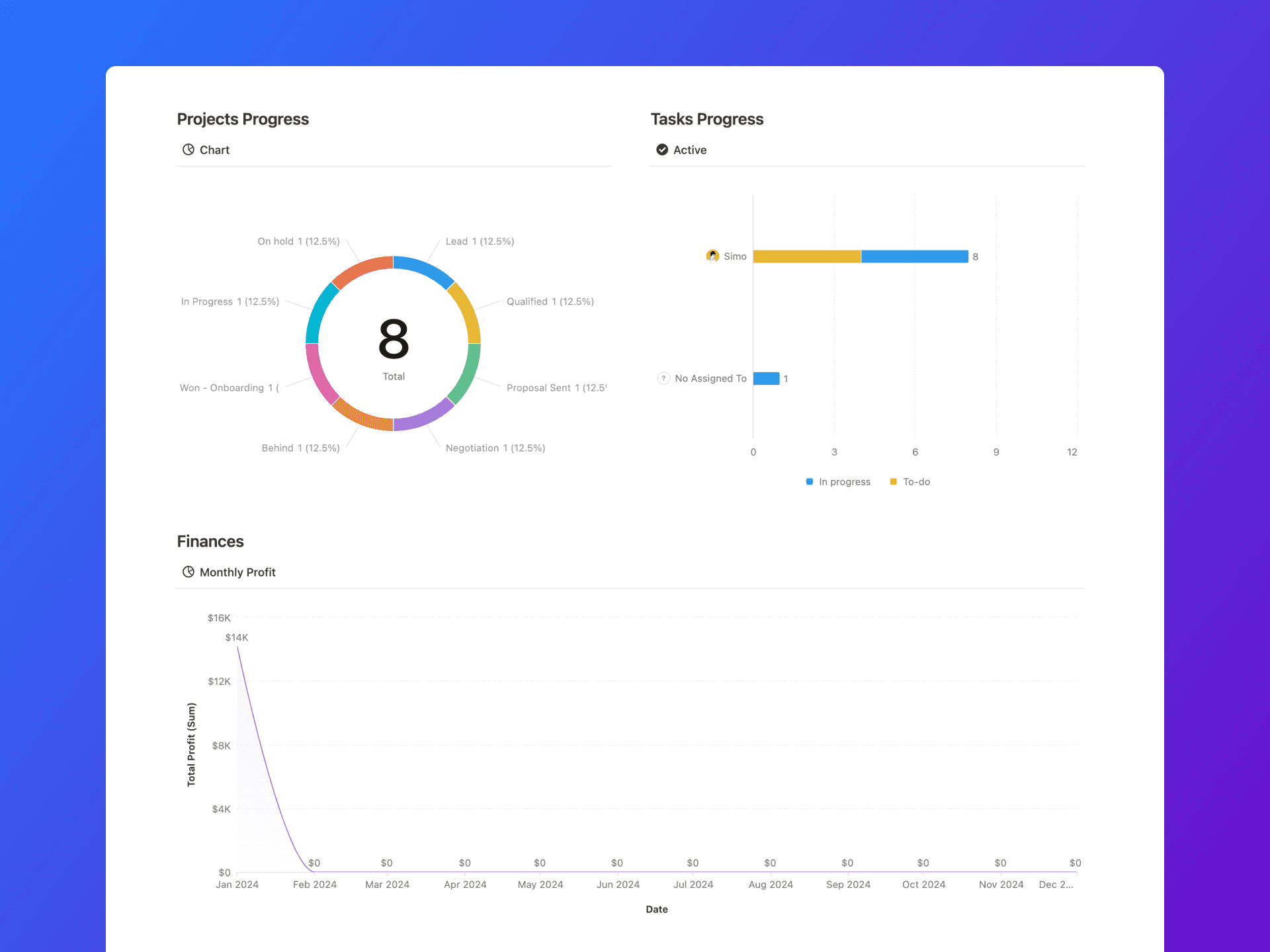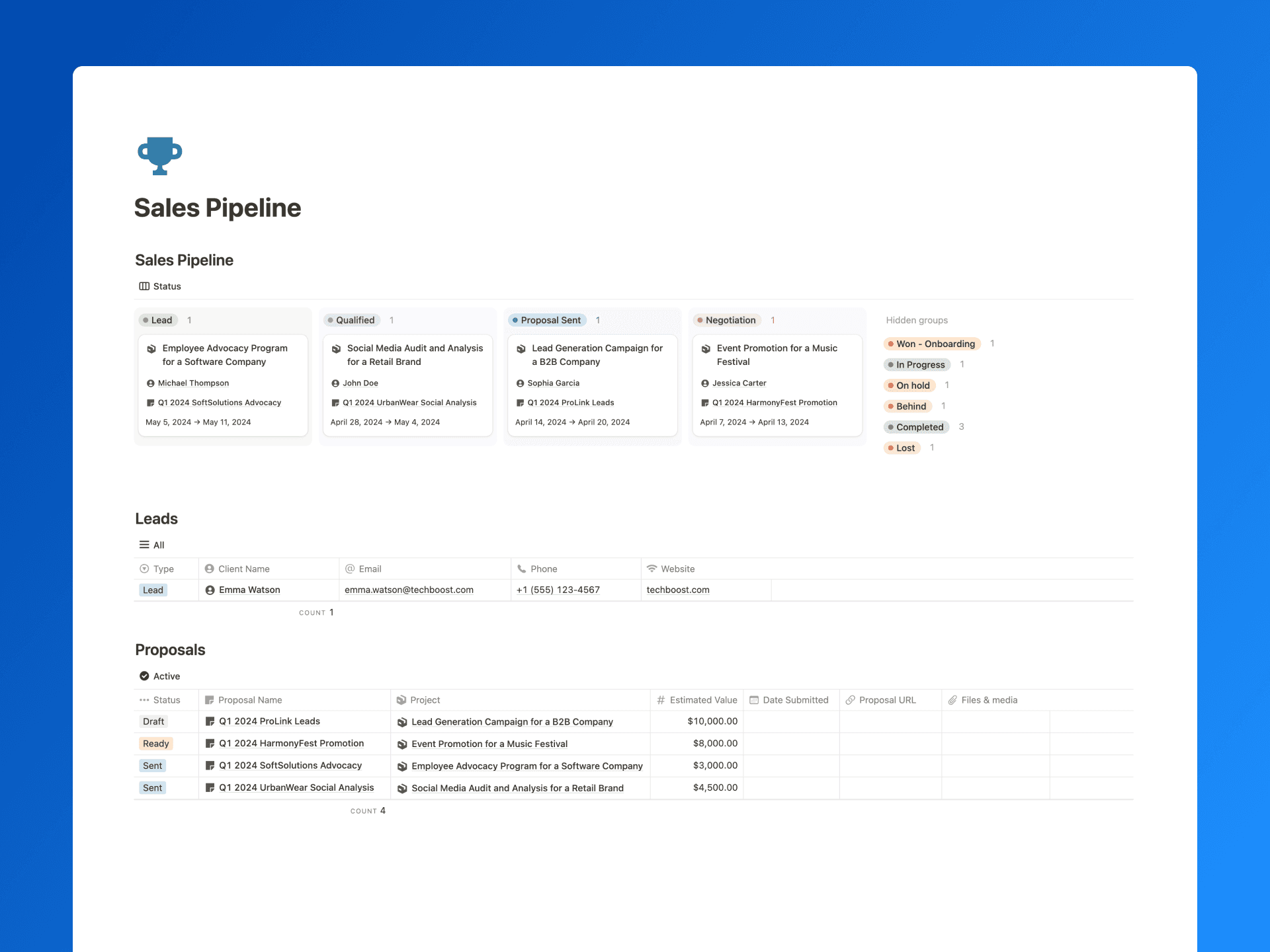 Track your prospects and manage customer relationships effortlessly by monitoring proposal statuses and sales opportunities in one view.