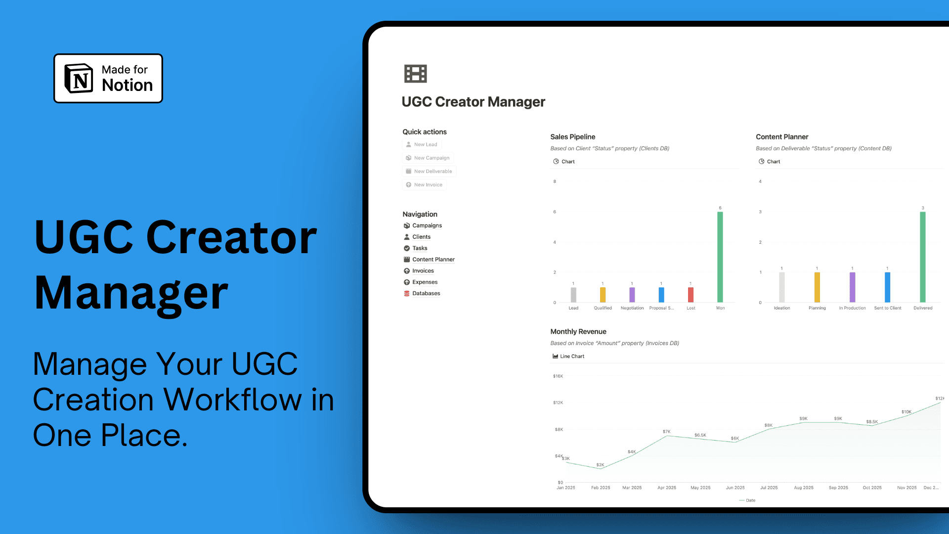 Manage campaigns, clients, content, deliverables, tasks, invoices & expenses in one UGC hub.